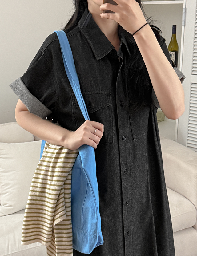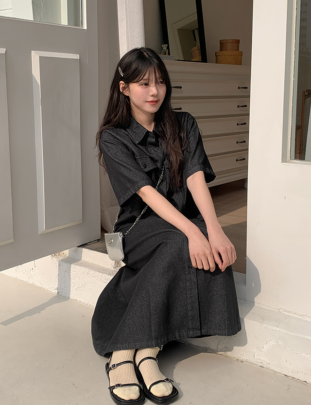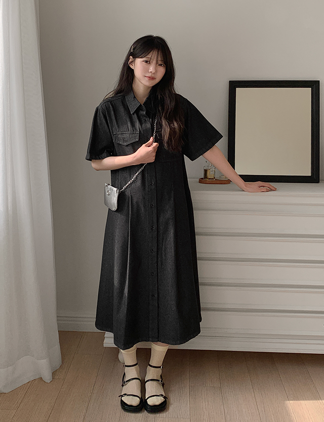 다크그레이 컬러의 데님 원피스예요.