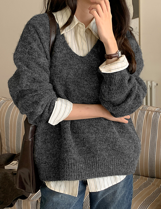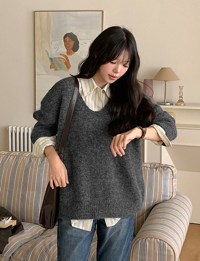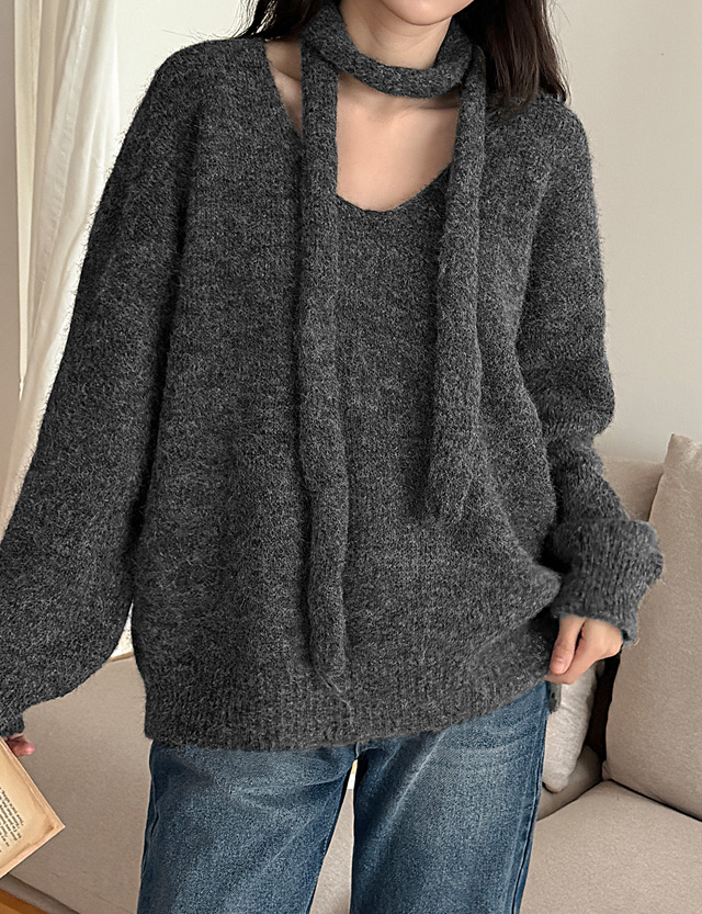 헤어리 Alpaca Wool V-neck Knit muffler Set 84226
