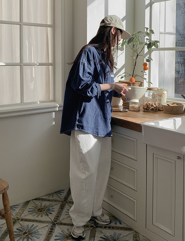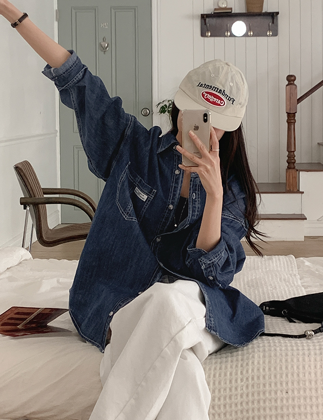 grid loose fit Labels 포켓 Denim Shirt 86396