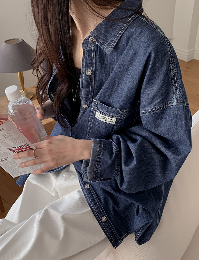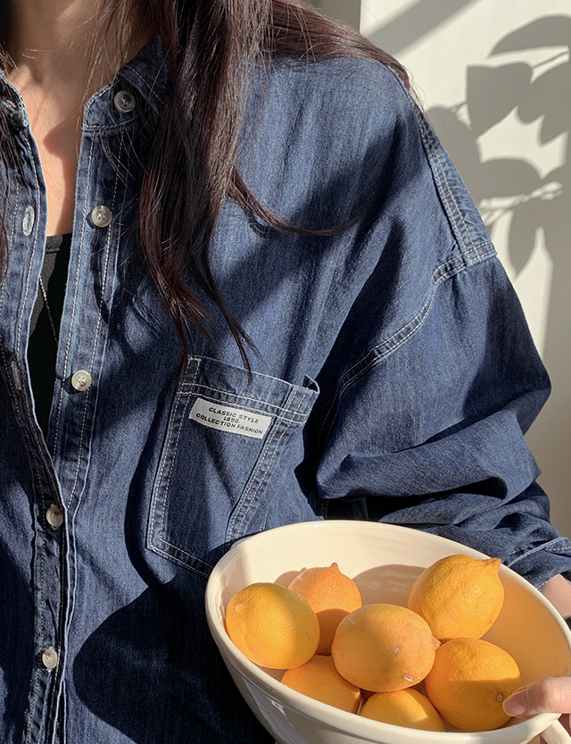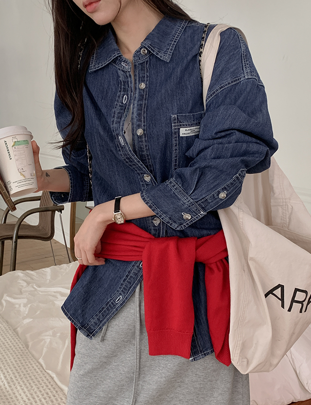 grid loose fit Labels 포켓 Denim Shirt 86396